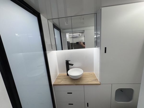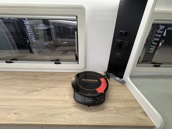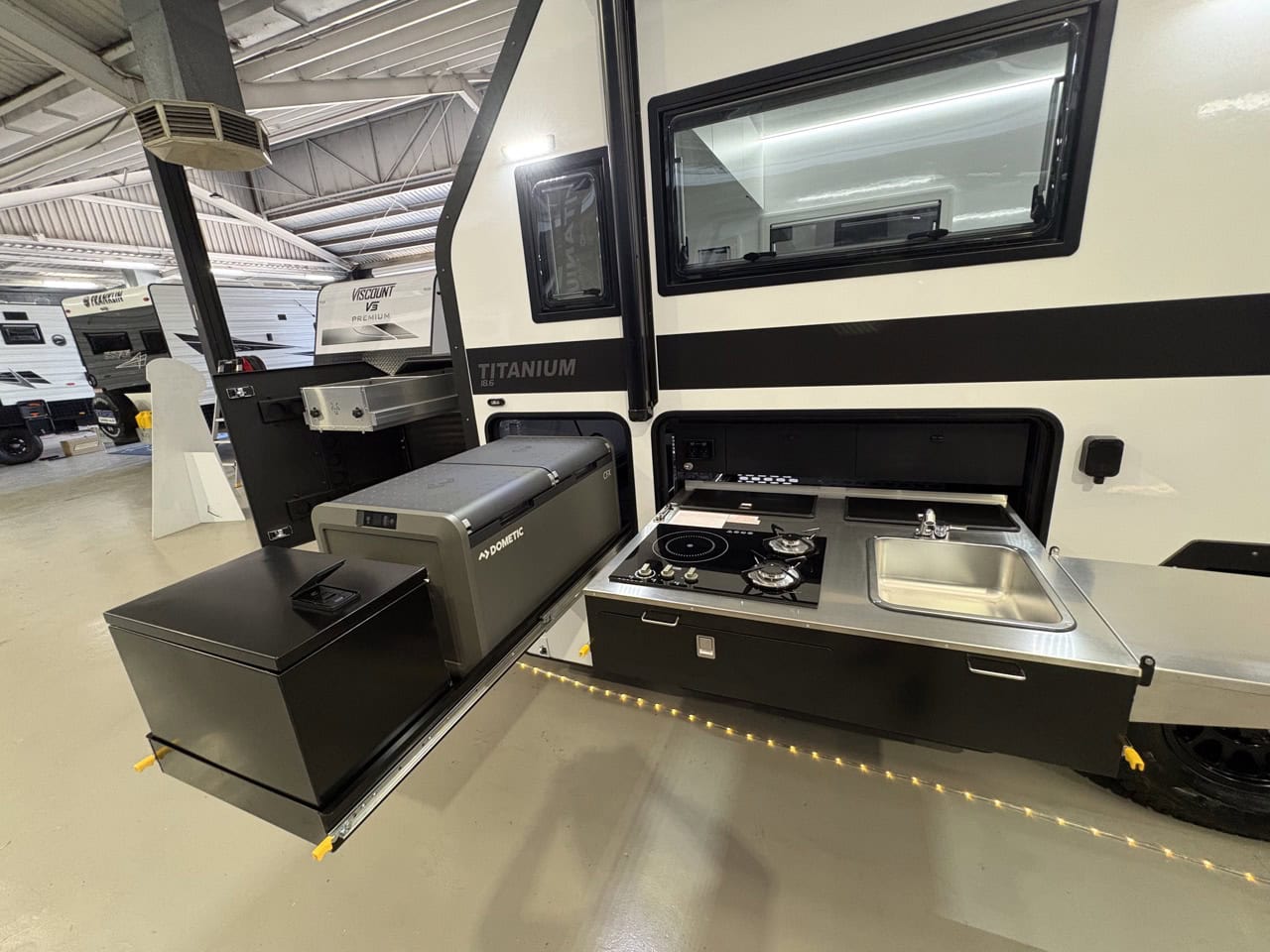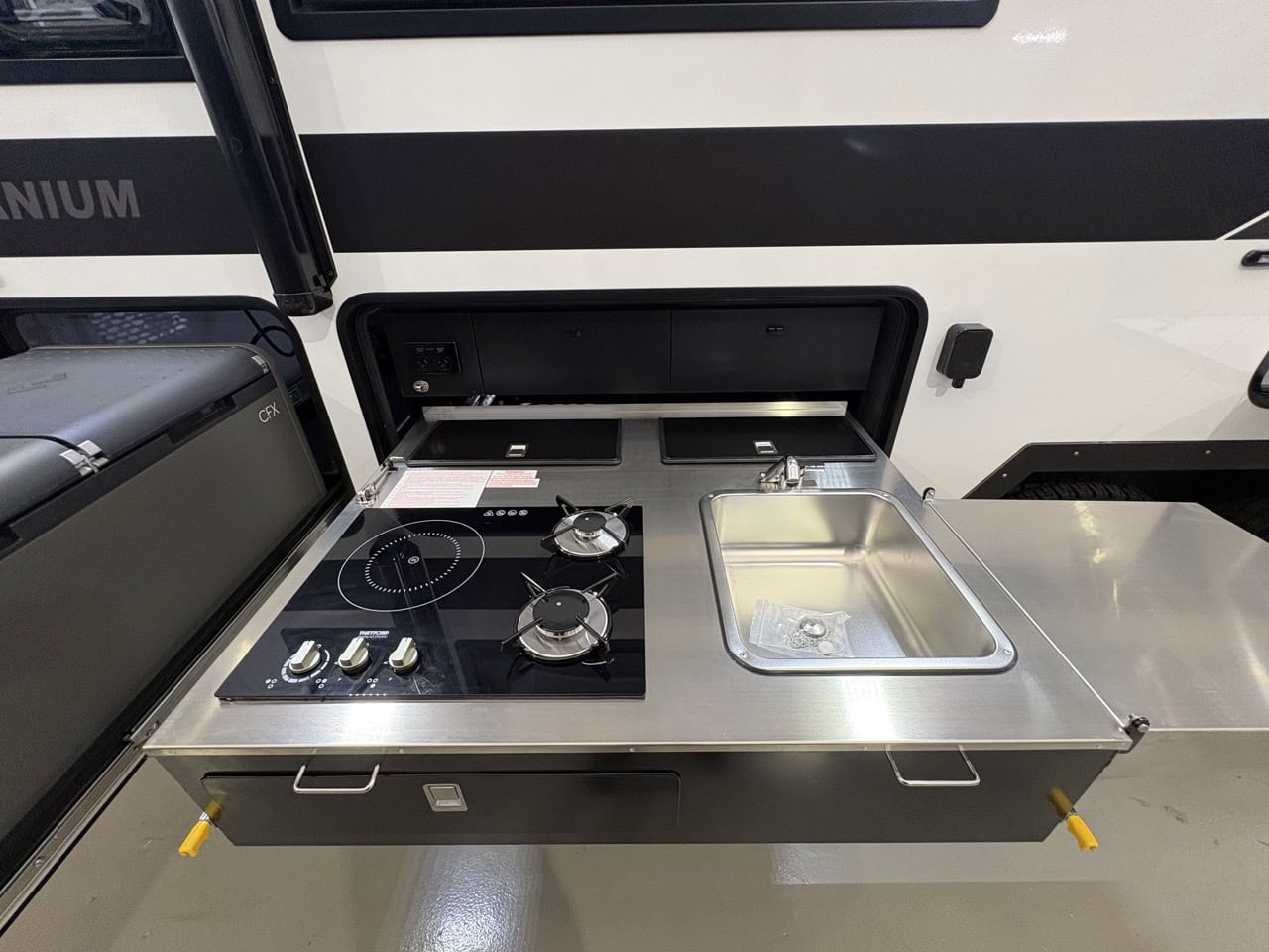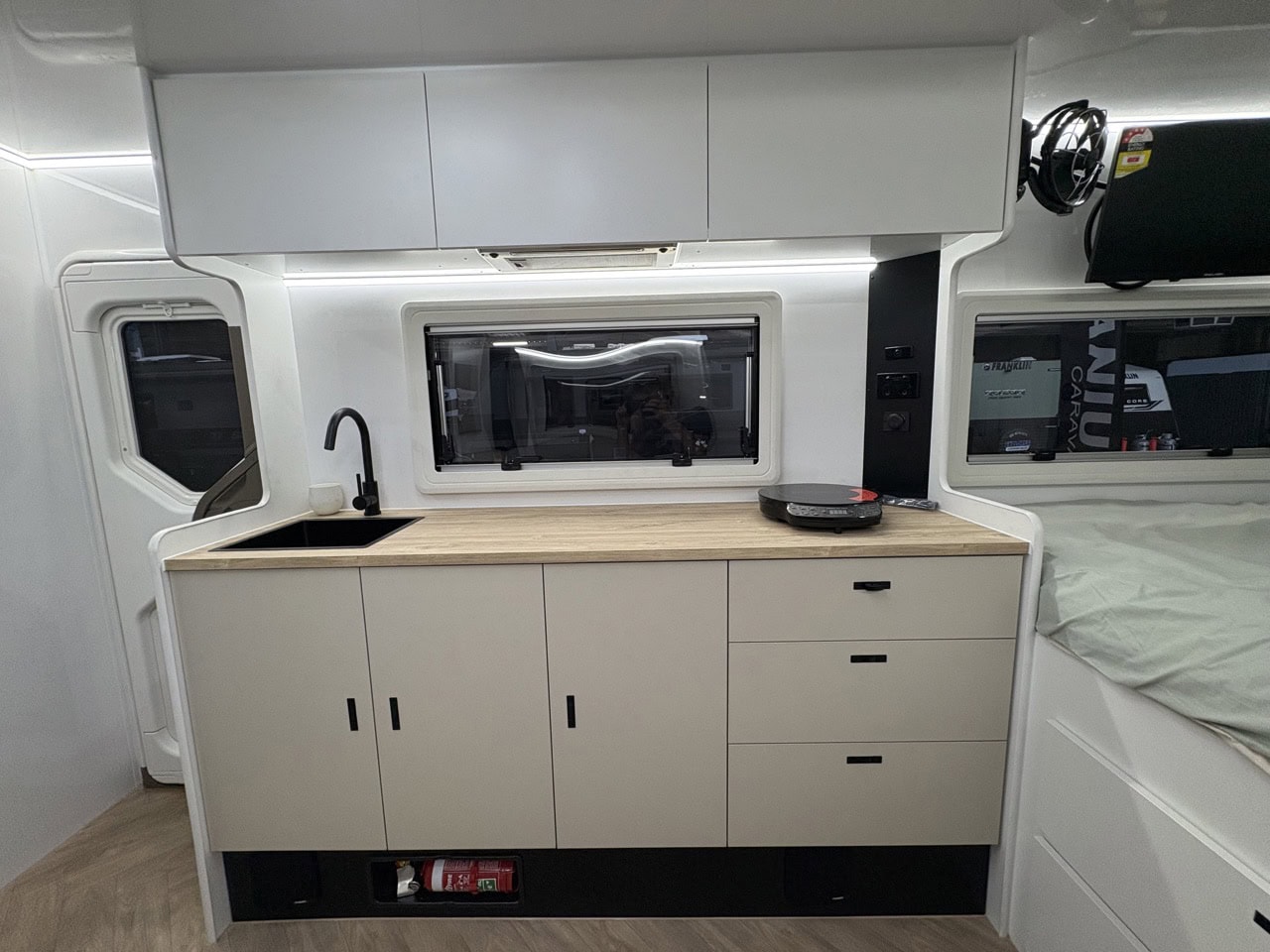 - Slide out kitchen with built-in storage drawers to suit portable induction