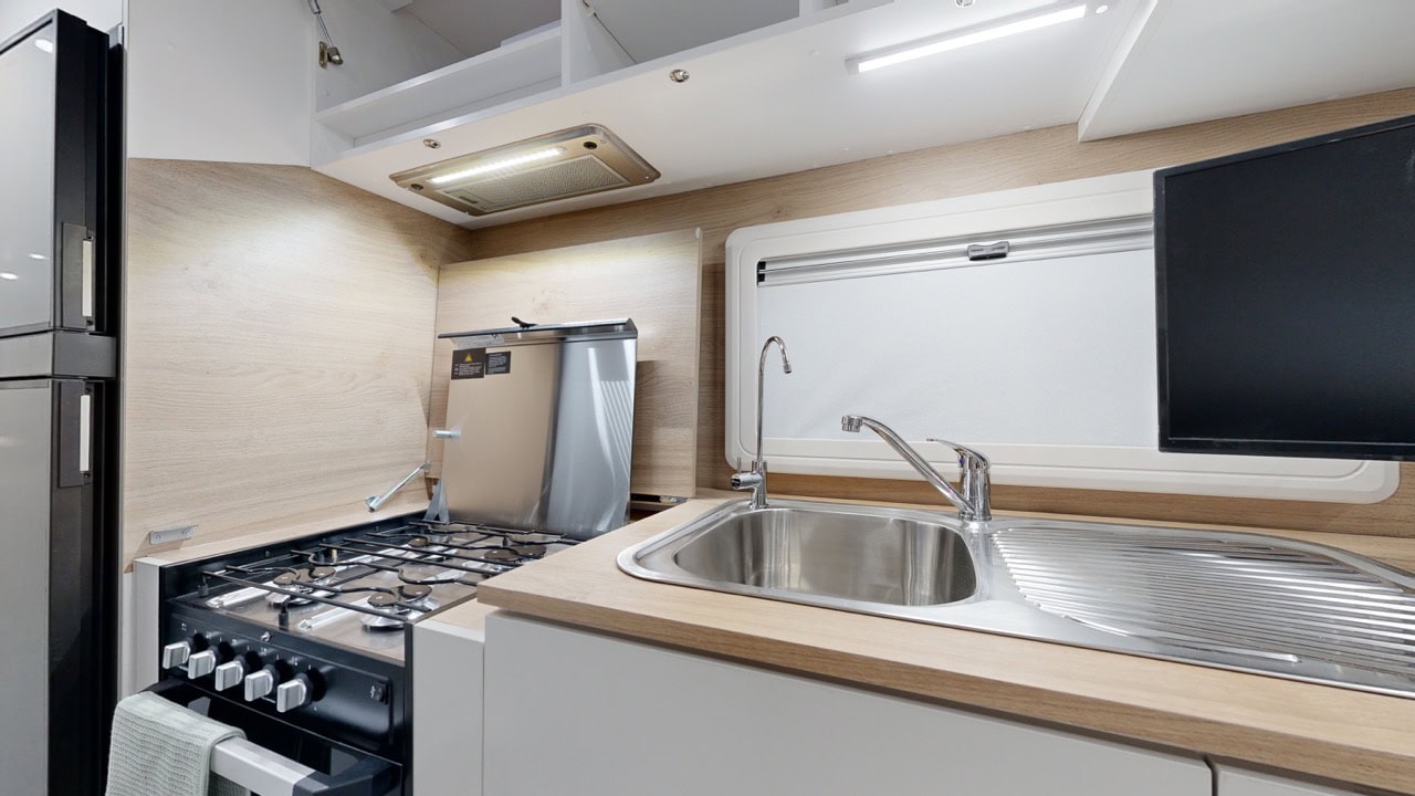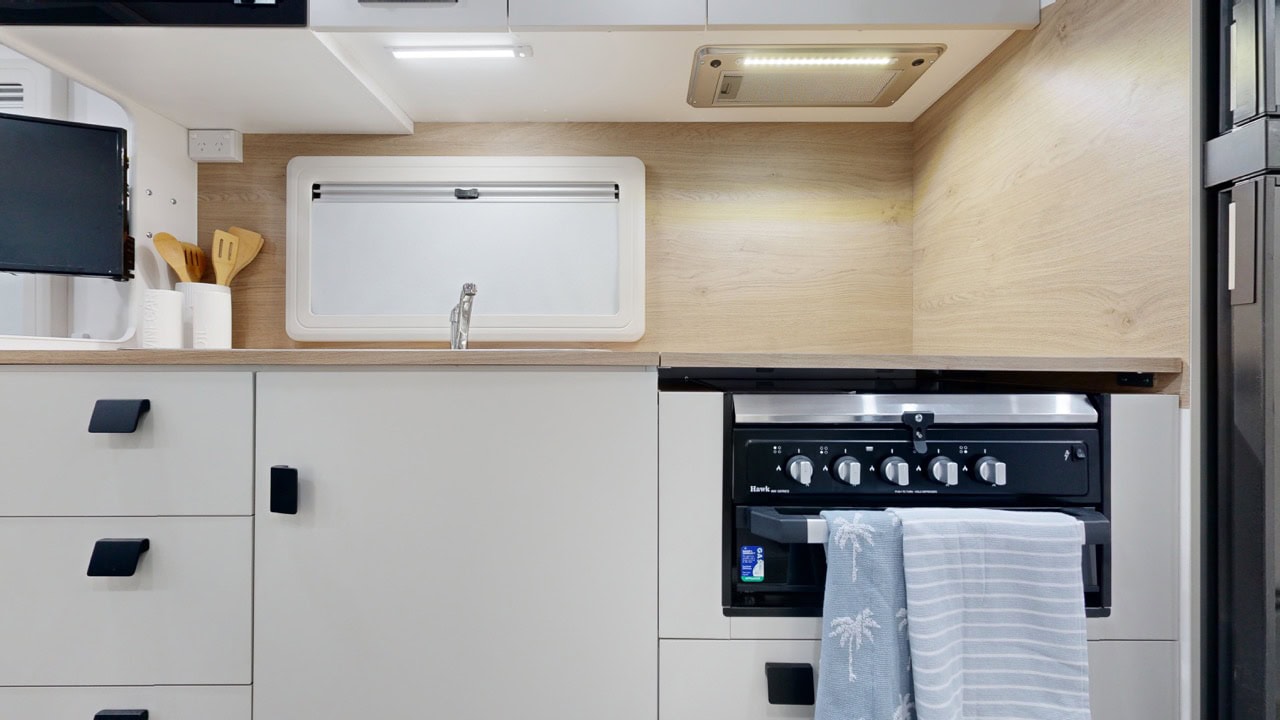 There’s plenty of great features standard to the Core range like the 200w solar panel and the lift up bench over the gas cooktop.